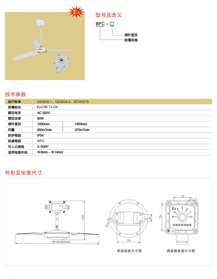 ◇防爆吊扇由防爆电机、扇叶、接线盒、防爆调速器等部分组成;